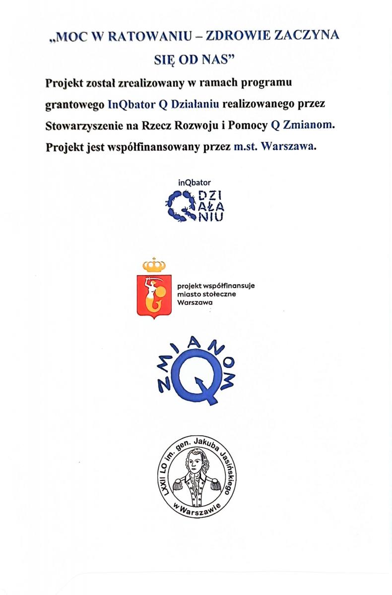 W minionym roku szkolnym nasza szkoła uczestniczyła w programie grantowym InQbator Q Działaniu, realizowanym przez Stowarzyszenie na Rzecz Rozwoju i Pomocy Q Zmianom i współfinansowanym przez m.st. Warszawa. Dzięki temu wsparciu mogliśmy przeprowadzić wyjątkowy projekt edukacyjny pod nazwą „Moc w ratowaniu – zdrowie zaczyna się od nas”. Projekt skierowany był do uczniów klasy 3d ratownictwa medycznego oraz wybranych uczniów z klas 1c i 2d. Jego głównym celem było połączenie edukacji w zakresie zdrowego stylu życia z praktycznym przygotowaniem do przyszłych wyzwań zawodowych. W ramach projektu zrealizowano trzy etapy: