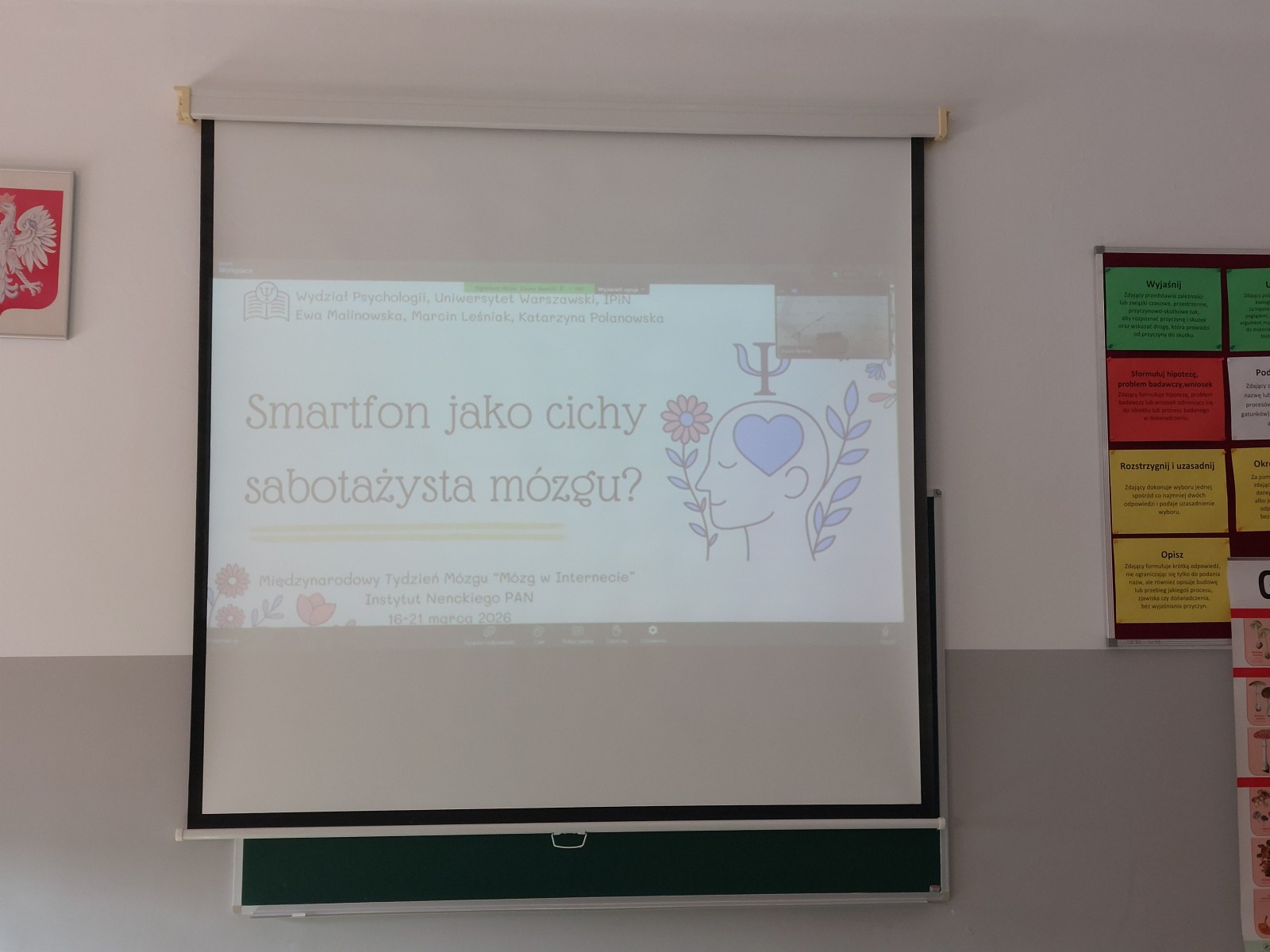 W środę, 18 marca 2026 r. o godz. 12:15, uczniowie wzięli udział w wykładzie online, który poprowadziła dr Ewa Malinowska z Wydziału Psychologii Uniwersytetu Warszawskiego. Wykład pt. „Smartfon jako cichy sabotażysta mózgu? Kilka słów o tym, jak korzystanie ze smartfonu wpływa na procesy uwagi, pamięci i nie tylko z perspektywy neuropsychologii klinicznej” poświęcony był wpływowi nowych technologii — w szczególności smartfonów — na funkcjonowanie procesów poznawczych, takich jak uwaga, pamięć i kontrola poznawcza. Prelekcja zwróciła uwagę na zagrożenia, ale także na możliwości bardziej świadomego i odpowiedzialnego korzystania z urządzeń cyfrowych.