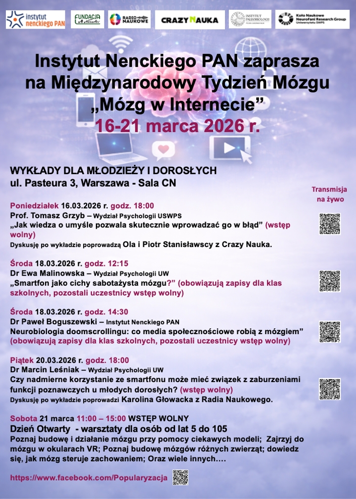 W ramach obchodów Międzynarodowego Tygodnia Mózgu 2026, organizowanego przez Instytut Nenckiego Polskiej Akademii Nauk pod hasłem „Mózg w Internecie”, uczniowie naszej szkoły uczestniczyli w wydarzeniach popularyzujących wiedzę o funkcjonowaniu ludzkiego mózgu.